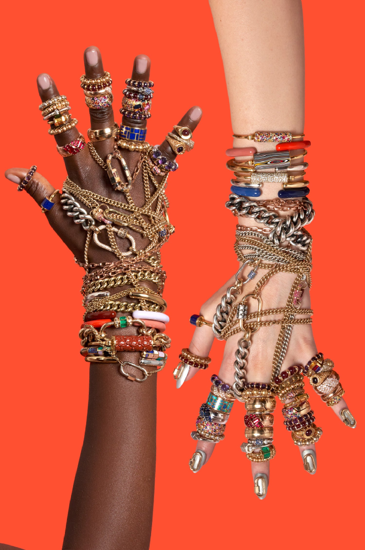 Jedes Stück von Marla Aaron vereint rohe Eleganz und technische Raffinesse. Verwendet werden edelste Materialien wie 18 Karat Gold, Sterling Silber, Diamanten und außergewöhnliche Edelsteine. Manche Schmuckstücke sind schlicht und stark, andere bunt & verspielt.